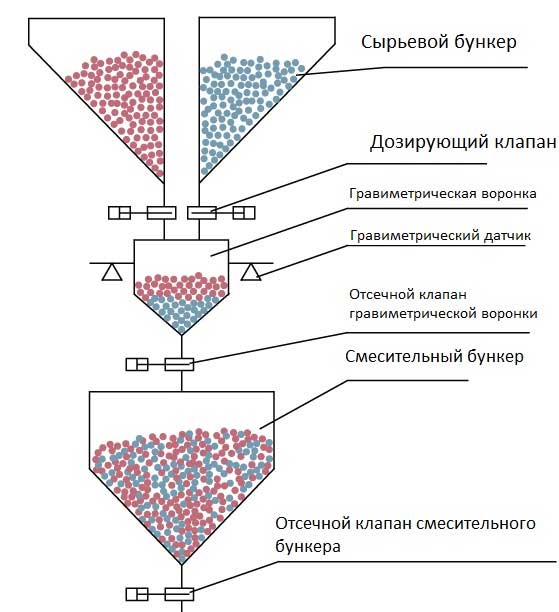 Принцип работы гравиметрического дозатора предусматривает дозирование компонентов в весовой бункер поочередно путем кратковременного открытия подающих клапанов на каждом бункере. В случае если рецептура предполагает введение материала в малых количествах (1-2% от общего состава рецептуры), для увеличения точности загрузки таких компонентов используются шнековые дозаторы.