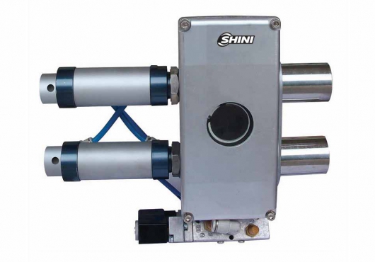 - Два клапана, управляемых пневмоцилиндрами, поочередно регулируют подачу полимерных материалов по каждому из каналов.