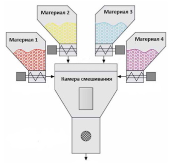 Блок управления подает сигнал о запуске двигателей дозирующих станций. Посредством вращения шнеков материалы одновременно, но в разных пропорциях подаются в камеру смешивания, где гранулы, ударяясь о стенки, перемешиваются.
