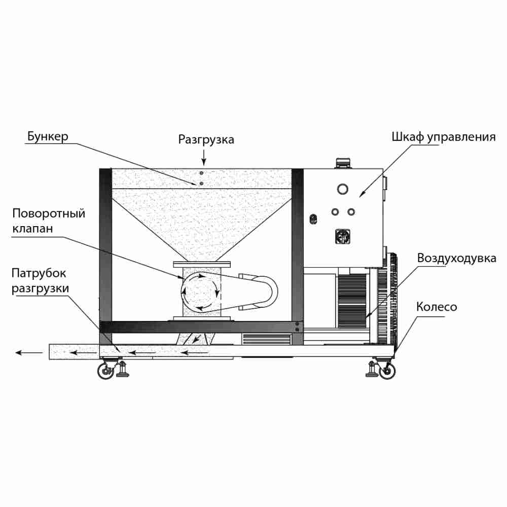 - Указанная производительность приведена при использовании гранул c насыпной плотностью 0.65 кг/л, диаметром 3 - 5 мм, вертикальной дистанцией 10м, горизонтальной дистанцией 15м. Увеличение расстояния транспортировки может привести к закупорке трубы.