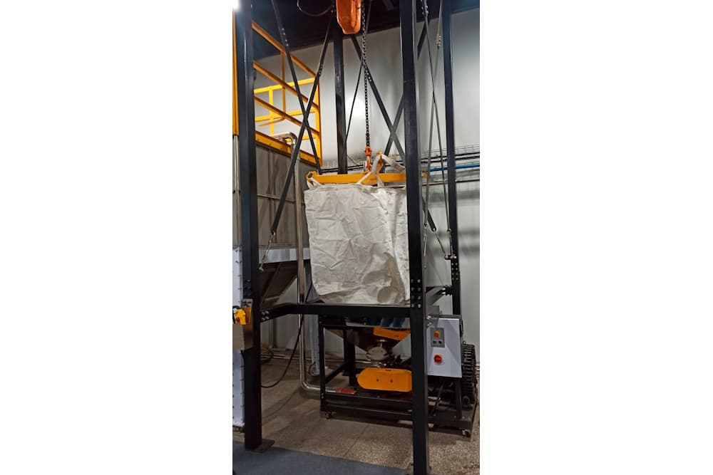 Станция растаривания SS-TKD используется для выгрузки сырья из биг бегов. Оснащена всасывающей коробкой, имеющей от одного до нескольких выходов, для транспортировки материалов в силос или на производственный участок. Станция растаривания SS-TKD состоит из рамы, разгрузочного бункера, всасывающей коробки и электрического тельфера. Биг бег с помощью тельфера подвешивается на раме, оператор надрезает его и высыпает содержимое в бункер.