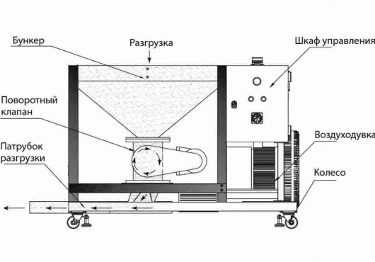 - Указанная производительность приведена при использовании гранул c насыпной плотностью 0.65 кг/л, диаметром 3 - 5 мм, вертикальной дистанцией 10м, горизонтальной дистанцией 15м. Увеличение расстояния транспортировки может привести к закупорке трубы.