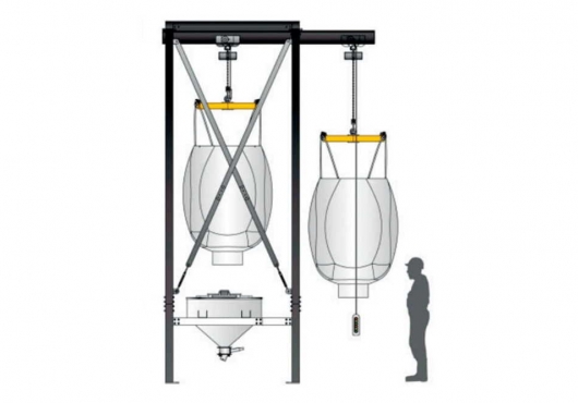 Станция растаривания SS-TKD используется для выгрузки сырья из биг бегов. Оснащена всасывающей коробкой, имеющей от одного до нескольких выходов, для транспортировки материалов в силос или на производственный участок. Станция растаривания SS-TKD состоит из рамы, разгрузочного бункера, всасывающей коробки и электрического тельфера. Биг бег с помощью тельфера подвешивается на раме, оператор надрезает его и высыпает содержимое в бункер.