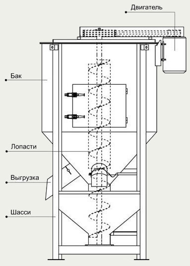 Устройство вертикального шнекового смесителя состоит из конического или цилиндрического корпуса форма которого предотвращает зависание сырья внутри бункера, вертикально расположенного шнека, установленного по центру смесительной камеры, мотор редуктора, приводящего в движение шнек, и загрузочного с выгрузным люков. Все поверхности, контактирующие с материалом, выполнены из нержавеющей стали для исключения загрязнения материала. Компоненты смеси загружаются в лоток в нижней части корпуса, под действием вращения шнека гранулы поднимаются со дна до самого верха, где рассыпаются и вновь сползают по стенкам бункера. Процесс повторяется многократно, сопровождаясь завихрениями в слое сырья. Вертикальный шнековый смеситель способен очень быстро довести смесь до однородного состояния, обладает большой производительностью и наиболее часто применяется при больших масштабах производства.
