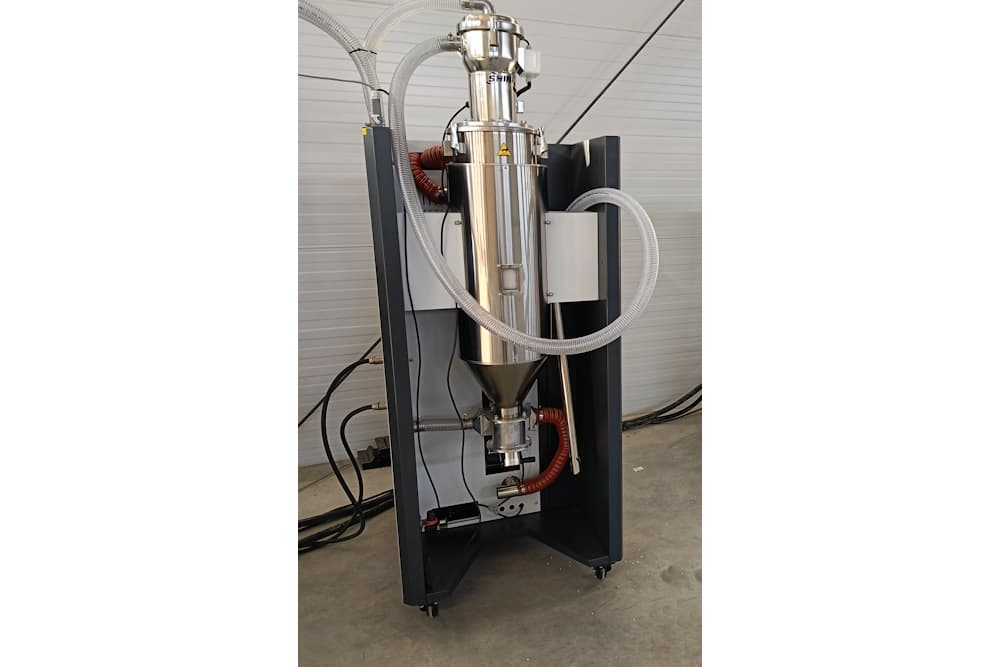 Осушитель SCD-120U/80H это компактный комплекс, включающий в себя бункер-сушилку, осушитель (влагопоглотитель) и вакуумный автозагрузчик, обеспечивающий загрузку материала в осушитель и последующую загрузку осушенного материала в оборудование. Все операции загрузки и сушки сырья реализуются в автоматическом режиме. Подходит для сушки гигроскопичных полимерных материалов, требующих осушения до 0,02 - 0,04% содержания влаги, таких как: ПА, ПК, ПЭТ, ПБТ.