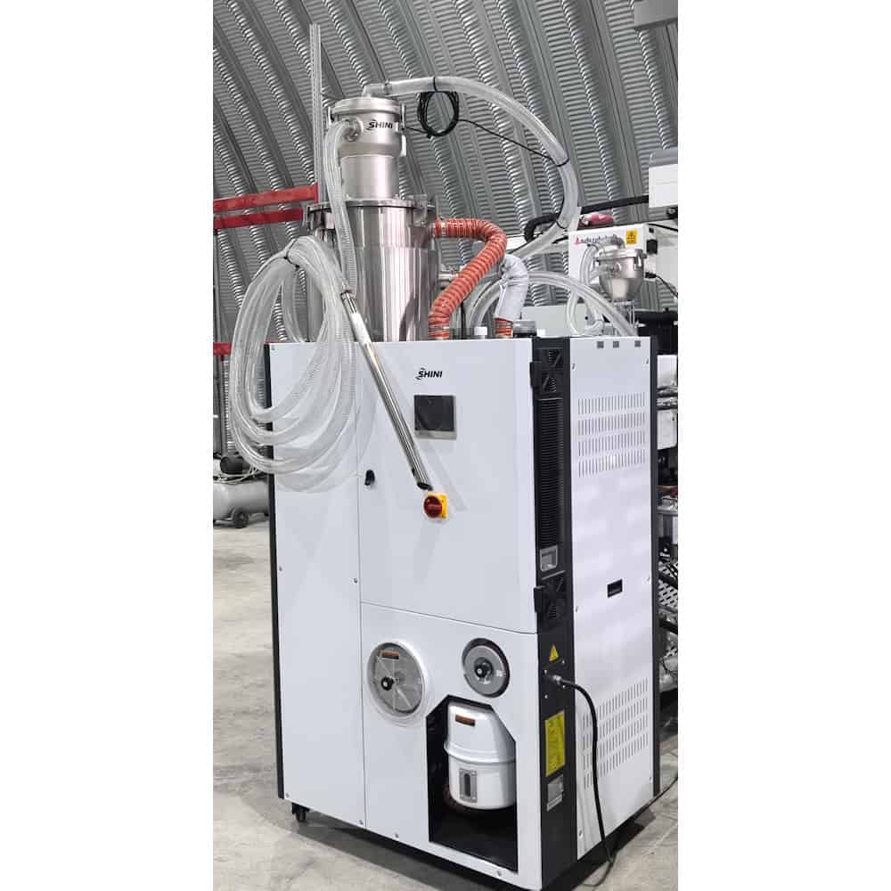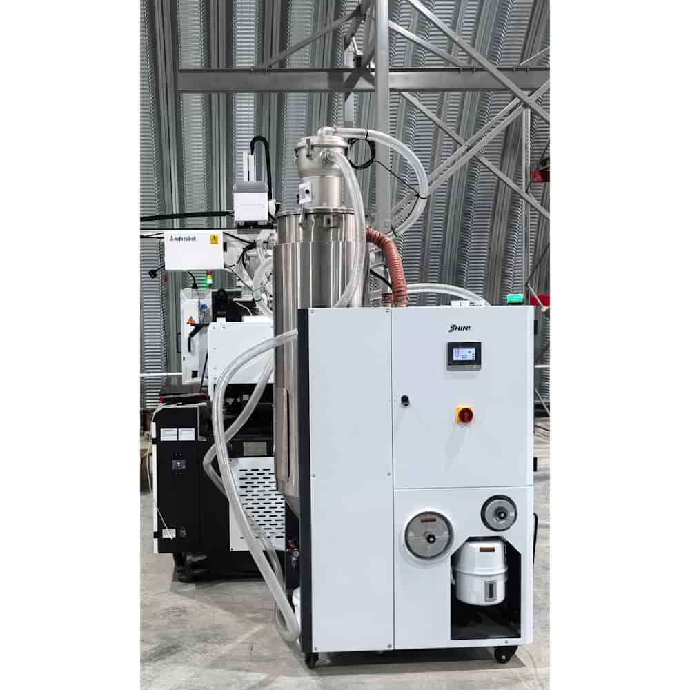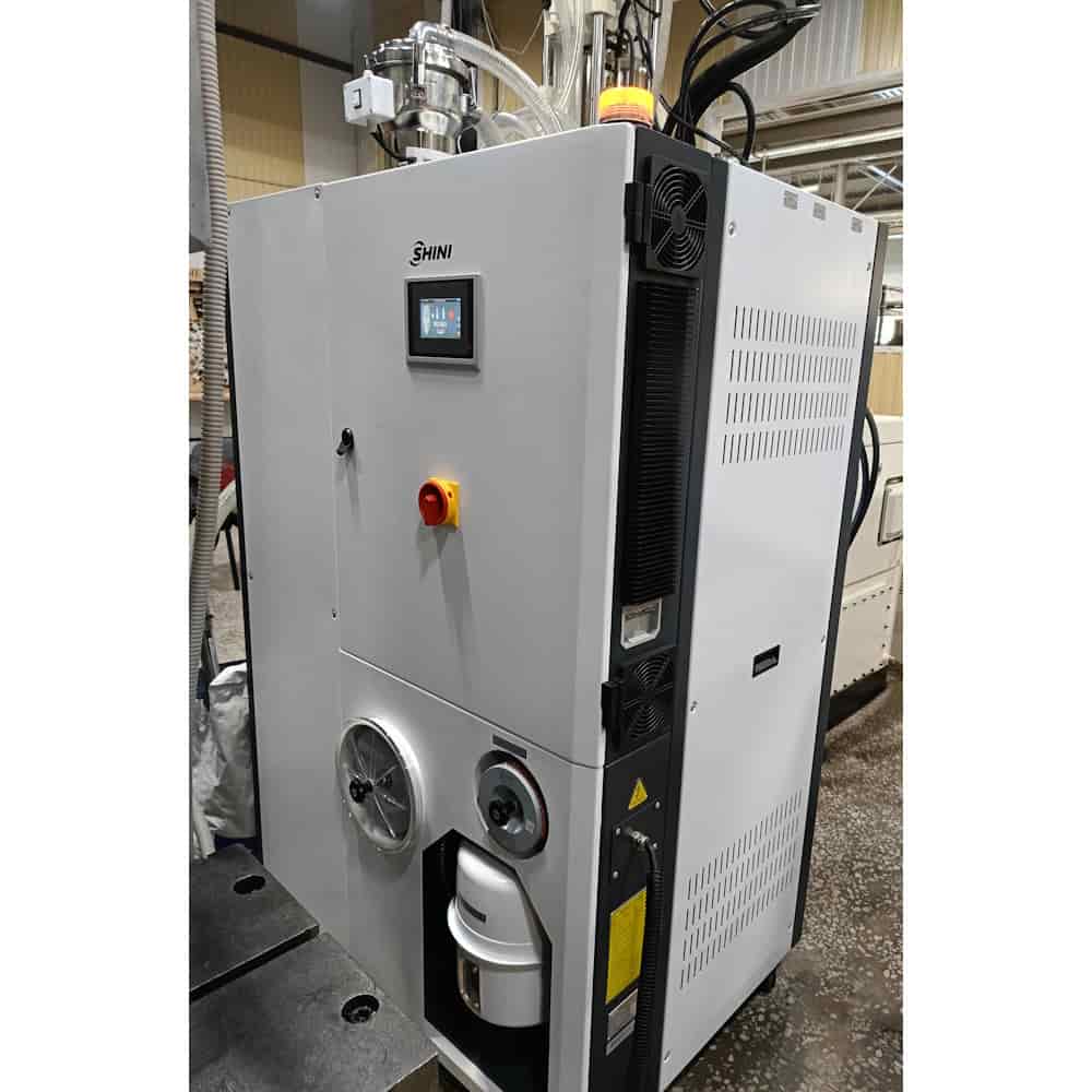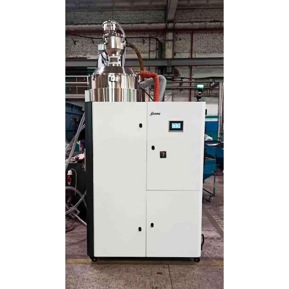 Сушилка для пластика Shini серии SCD «Три в одном» - это компактный комплекс, включающий в себя бункер-сушилку, осушитель (влагопоглотитель) и вакуумный автозагрузчик, обеспечивающий загрузку материала в осушитель и последующую загрузку осушенного материала в оборудование. Все операции загрузки и сушки сырья реализуются в автоматическом режиме. Данная серия объемом от 40 до 1200 литров подходит для сушки гигроскопичных полимерных материалов, требующих осушения до 0,02 - 0,04% содержания влаги, таких как: ПА, ПК, ПЭТ, ПБТ.