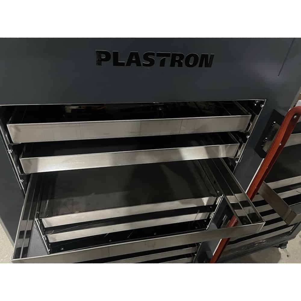 Сушильный шкаф для пластмасс Plastron серии PPCD предназначен для сушки полимерных гранулированных материалов на лотках с заданной температурой. Температура в сушильном шкафу поддерживается термоконтроллером, лотки выполнены из нержавеющей стали, двигаются по металлическим полозьям. Подогретый до заданной температуры воздух поступает равномерно к лоткам с материалом по многочисленным воздуховодам. Для того чтобы сушка полимеров была эффективной, конструкция шкафа спроектирована таким образом, чтобы воздух равномерно циркулировал по всему пространству, обеспечивая одинаковый прогрев всего осушаемого материала.
