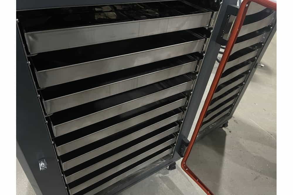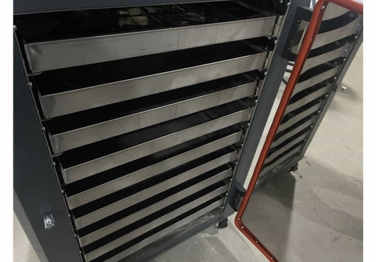 - Сушильный шкаф имеет мощность 9 кВт, 20 лотков, температуру нагрева до 250 градусов.