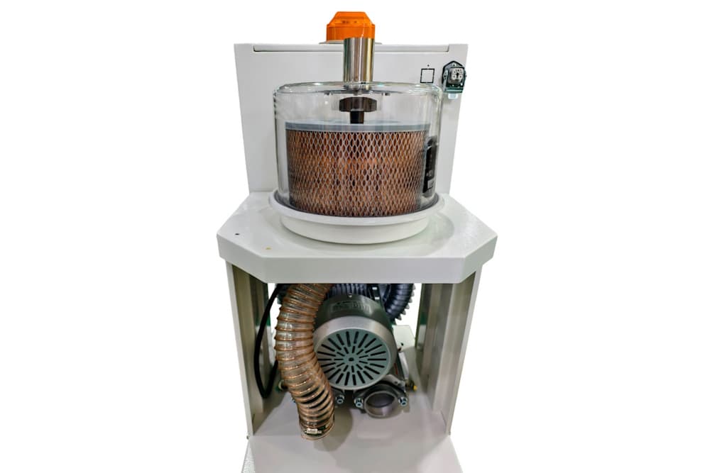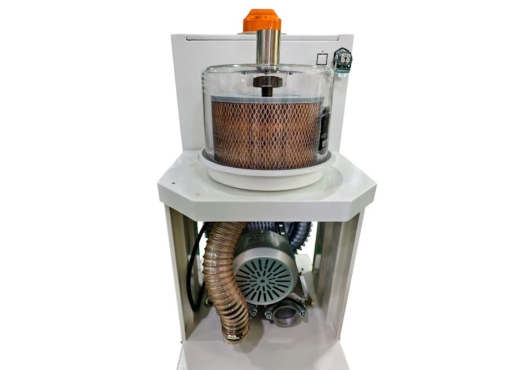 Опционально комплектуется циклонным сепаратором пыли. Насыщенный пылью воздушный поток вращается под действием центробежной силы с высокой скоростью в циклонном пылеуловителе, при этом пыль оседает на внутренней стенке пылеуловителя. В результате, под действием силы тяжести пыль опускается вниз через отводное отверстие. Поток воздуха отводится через выпускное отверстие. Данный принцип работы эффективен при фильтрации пыли из бункер-сушилки и позволяет избежать загрязнений воздуха. Эффективность до 80%.
