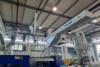 Вертикальный транспортер Alfarobot принимает изделия от робота. Соединен с роботом кабелем, обеспечивая точное получение изделия и защиту изделий от повреждений. После опускания автоматически наклоняется, чтобы изделия могли соскользнуть на рабочий стол. Поверхность из пластика, армированного стекловолокном, защищает изделия от возникновения царапин. Величина вертикального хода транспортера может быть отрегулирована в соответствии с высотой ТПА и робота.