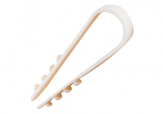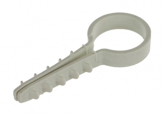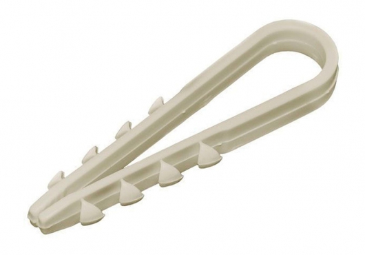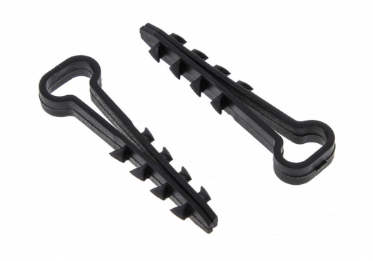 Дюбель-хомут представляет из себя гибкую полоску полимера в форме скобы, на концах которой находятся зубчики, при попадании в отверстие зубчики распираются и надежно фиксируют дюбель-хомут в стене. Применяется для крепления проводов, кабелей практически в любой материал: кирпич, бетон, газобетон, пенобетон, ДСП, дерево, фанеру.