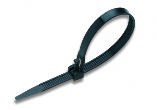 Хомут стяжка - это гибкая, плоская полоска полимера одна из сторон которой имеет ребристую поверхность. Когда свободный конец стяжки вставляется в ушко выступы препятствуют движению в обратном направлении. Предназначается для крепления проводов, кабелей к кабельным лоткам или другим конструкциям, используется для маркировки.