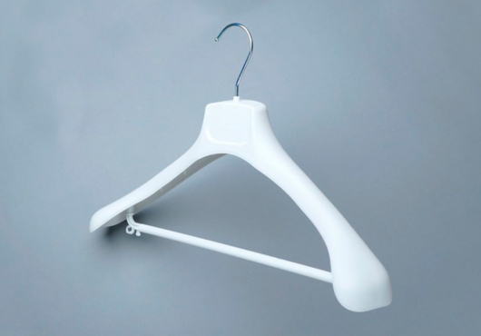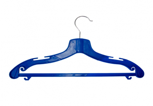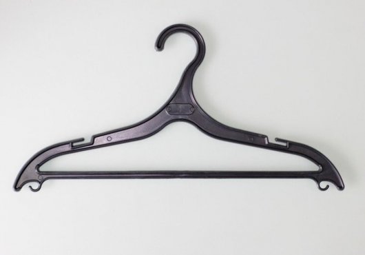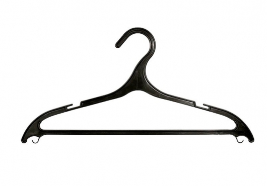 Вешалка из пластмассы - состоит из крючка и плечиков, одежда подвешивается на плечиках, крючком вешалка зацепляется за поперечную перекладину. Подвешенная на плечиках одежда не мнется, на ней не образуется складок.