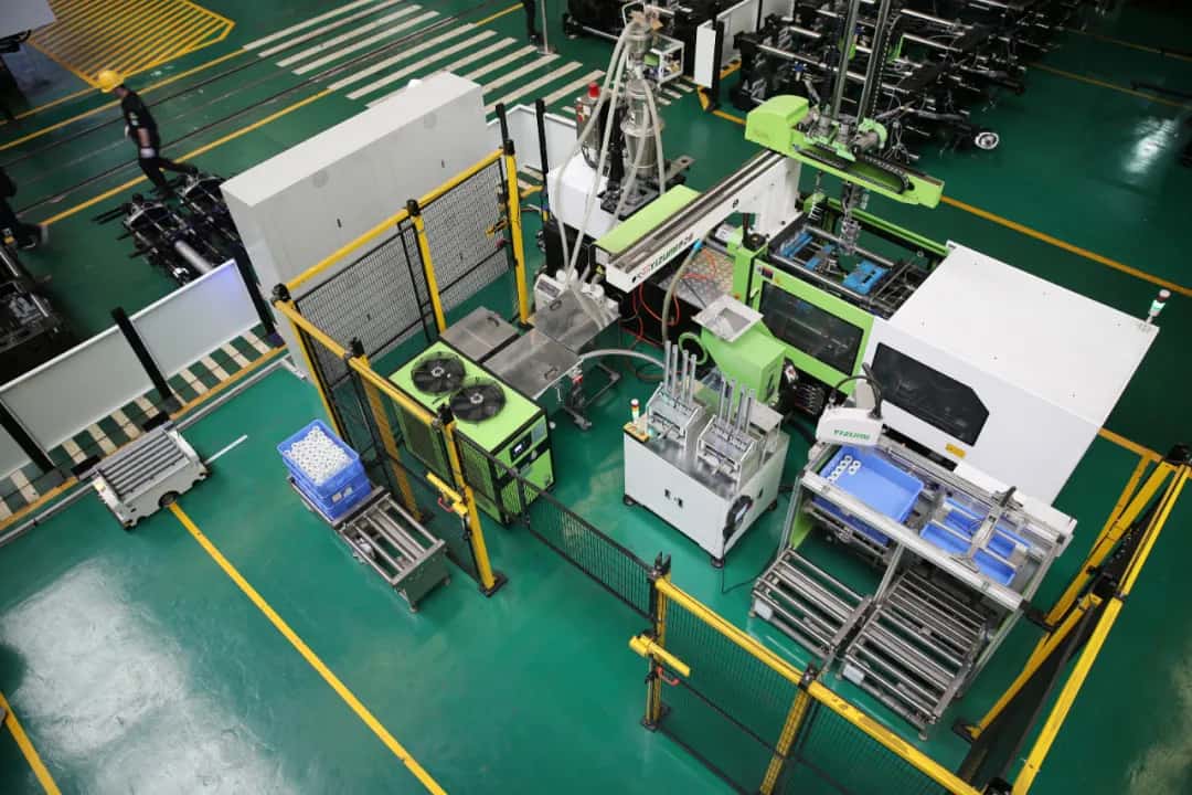 В производственном цехе YIZUMI установлена автоматизированная линия для производства роликов защитных дверей термопластавтоматов. Весь процесс производства осуществляется в автоматическом режиме: подача сырья, литье под давлением, автоматическая транспортировка и установка вкладышей подшипников, системы мониторинга в пресс-форме, автоматический сбор продукции, а также упаковка, складирование и прочие операции. Изготовленные ролики используются при сборке собственных термопластавтоматов (ТПА), что значительно снижает производственные издержки и сокращает необходимость во внешних закупках.